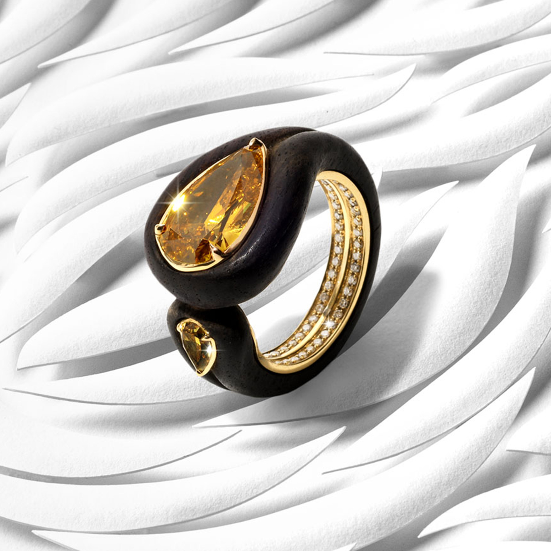 Unique to Lugano, our Magic Rings incorporate a proprietary mechanism that enables them to seamlessly switch between two different looks. With a sleek row of white diamonds set in the center of the textured gold band, gently twist them together and black diamonds or blue sapphires magically appear.