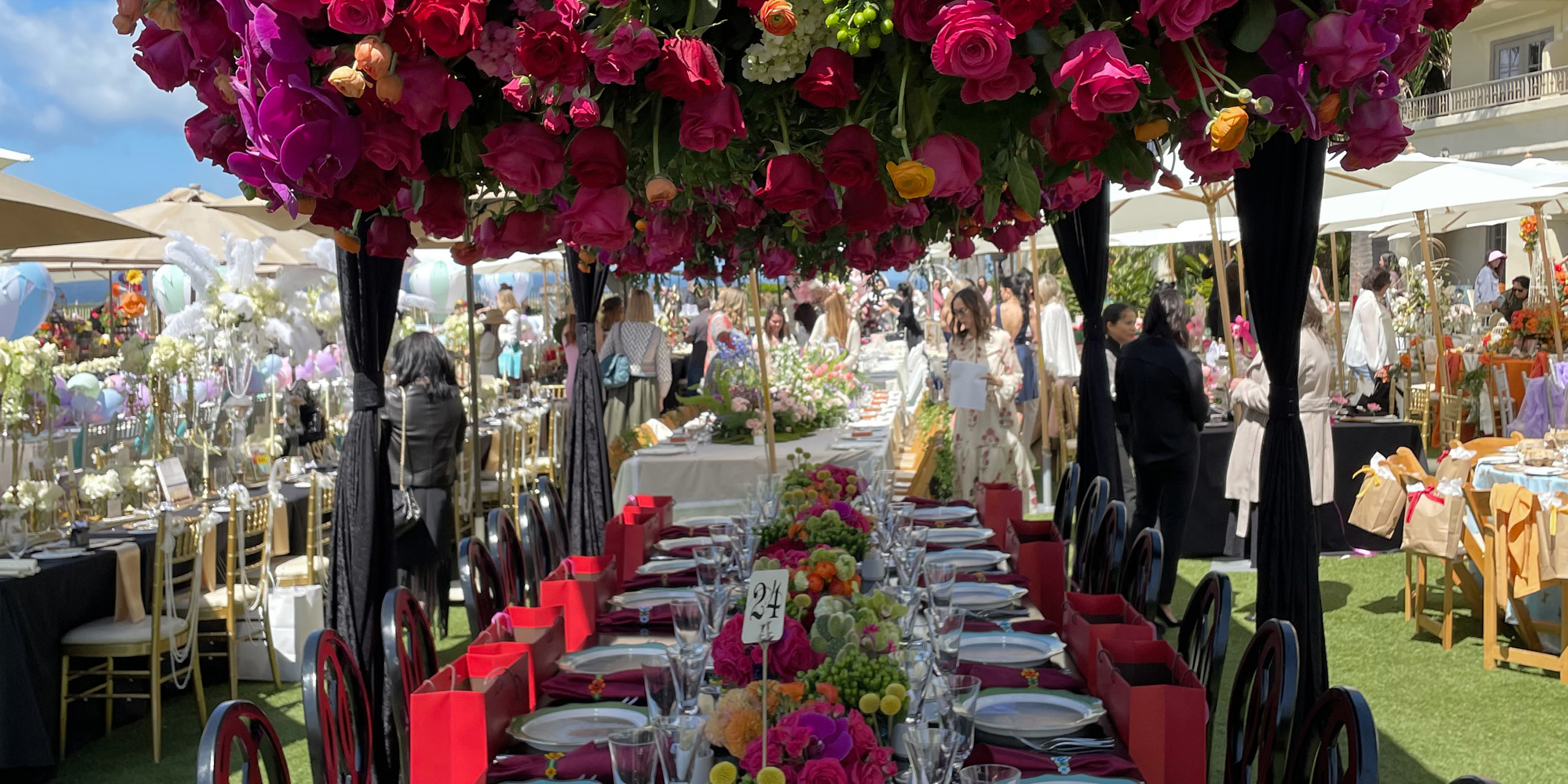 Lugano’s gravity-defying tablescape was inspired by Mexican artist, Frida Kahlo. The table was adorned overhead with a vibrantly-colored, large-scale, suspended floral installation as a nod to Kahlo’s signature flower crowns. Other tables were ornamented to celebrate authors Judy Blume and Agatha Christie, while other tables were decorated to represent favorites like The Wizard of Oz, Alice in Wonderland, Eloise at the Plaza, and The Devil Wears Prada.