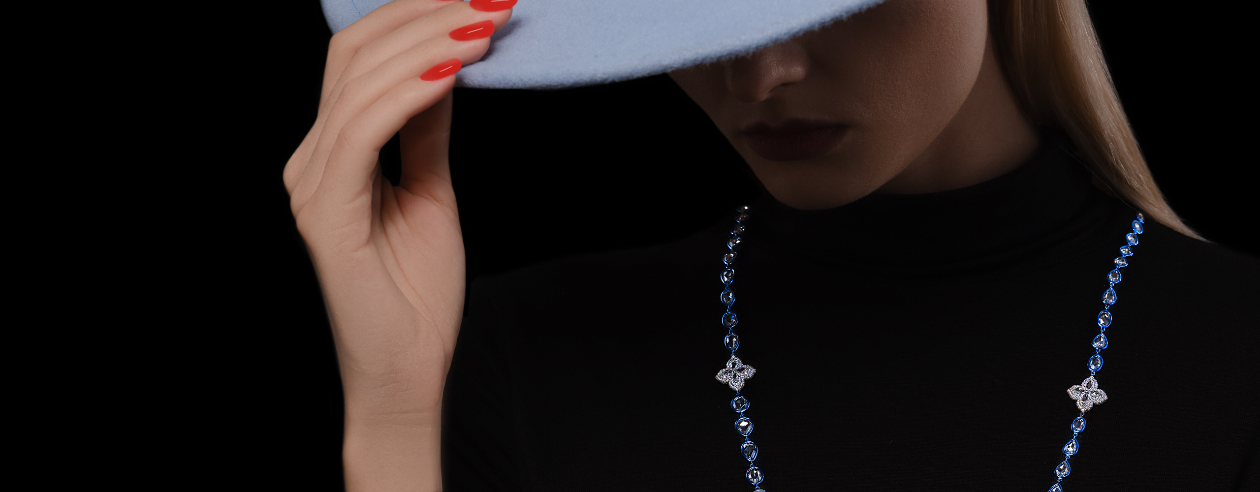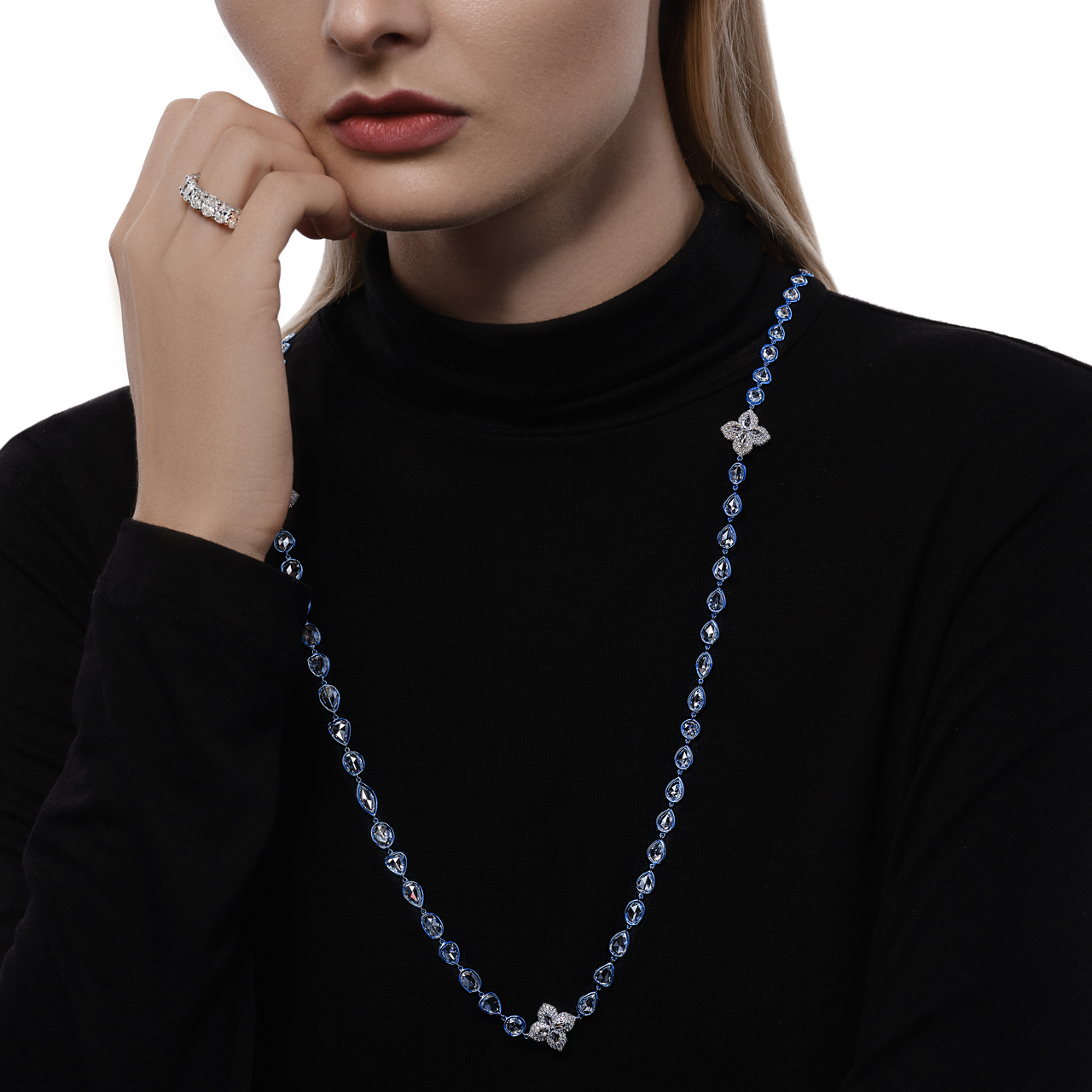Rose cut diamonds are set in blue ceramic strands interspersed with additional diamond flower shapes.